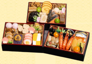 くるみ煮 酢牛蒡 若桃甘露煮 伊達巻 牛肉ごぼう時雨煮 柚子鶏つくね 紅白結び餅 椎茸旨煮 寿高野豆腐 紅鮭白醤油焼 こんにゃく旨煮