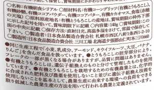 【原材料】有機コーングリッツ(有機とうもろこし)、有機砂糖、有機ココアパウダー、有機ココアバター、有機カカオマス、食塩(赤穂の天塩)